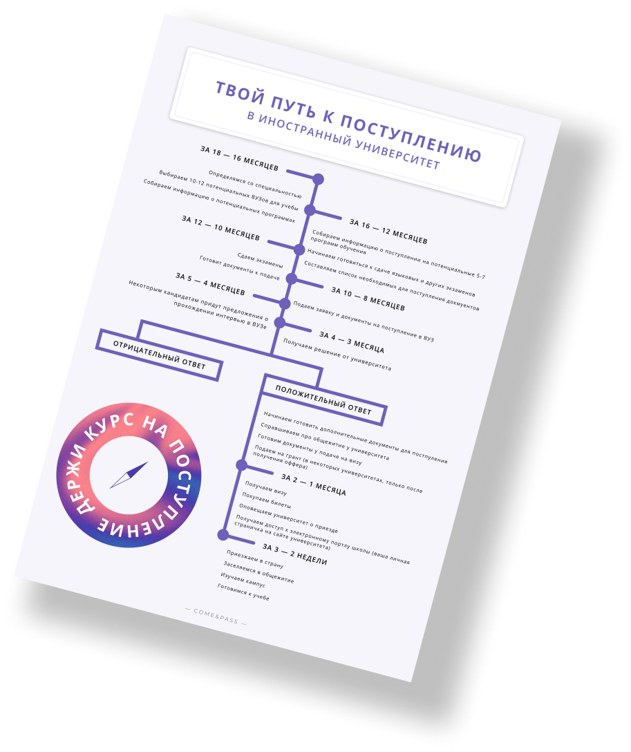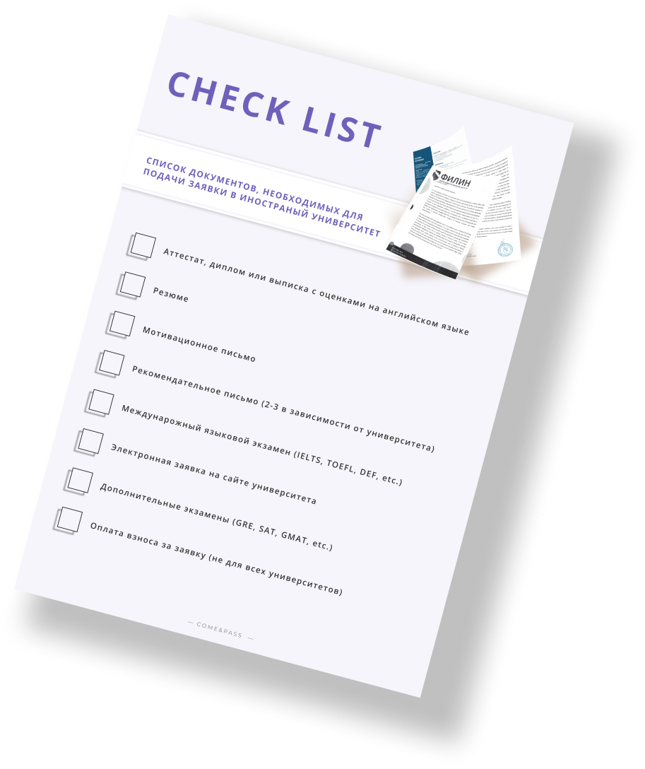 ✔️Набор из 5 чек-листов: которые помогут разобраться в нюансах поступелния и откроют тебе мир образования за границей ✔️Бесплатная 15-минутная консультация с командой Come&Pass по оценке шансов.