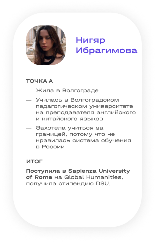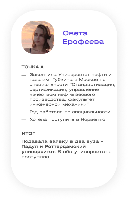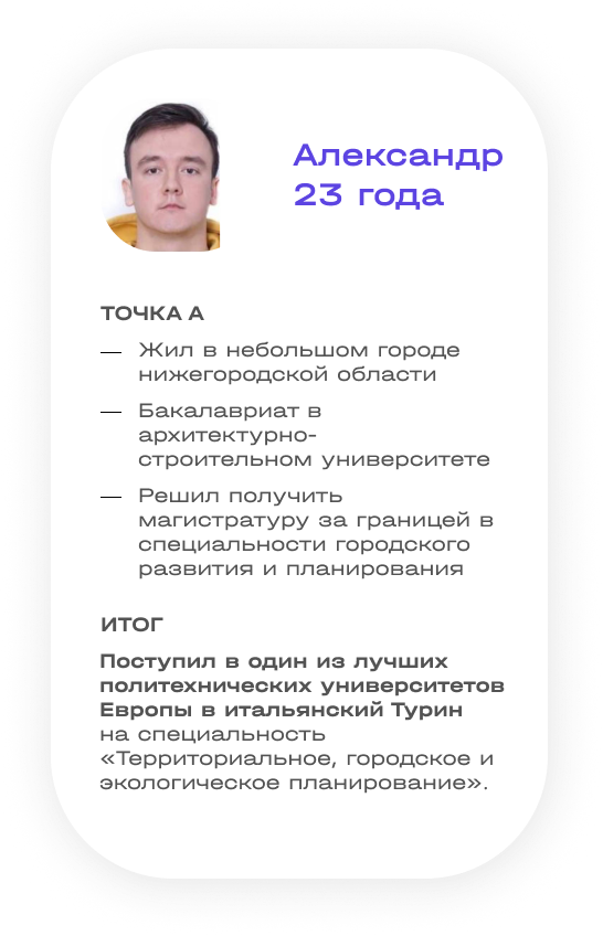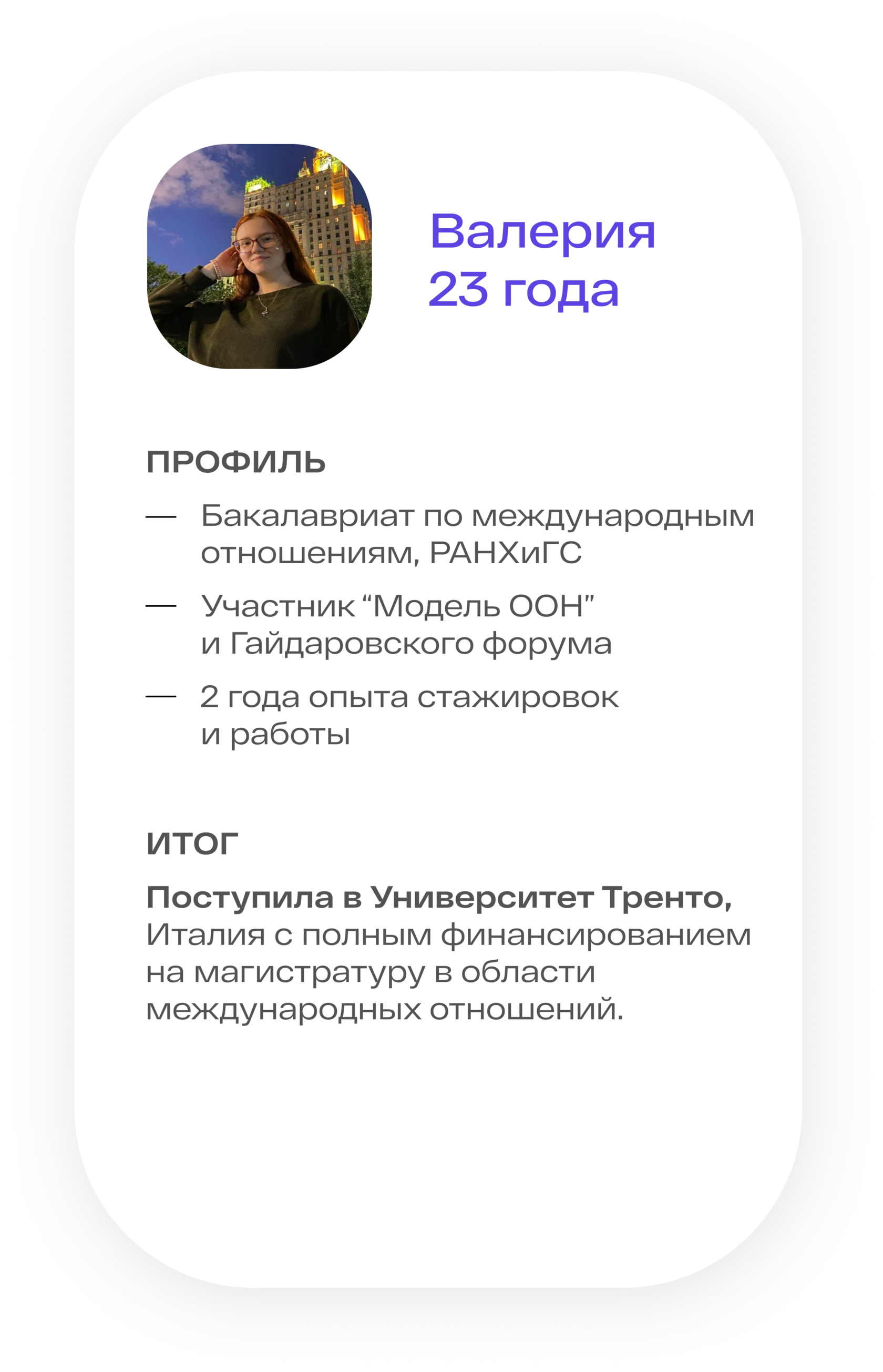 Вместе с экспертом ты не только определишься со специальностью и странами для поступления, но так же получишь подборку от 10 вузов и 5 стипендий со стратегией поступления, согласно твоим финансовым возможностям и пожеланиям
